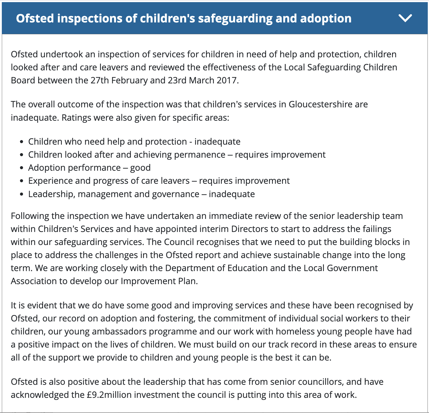 Gloucestershire council sorry for 'serious failings' in children’s services (Guardian 2017) https://www.theguardian.com/society/2017/jun/13/gloucestershire-council-sorry-serious-failings-childrens-services-ofsted