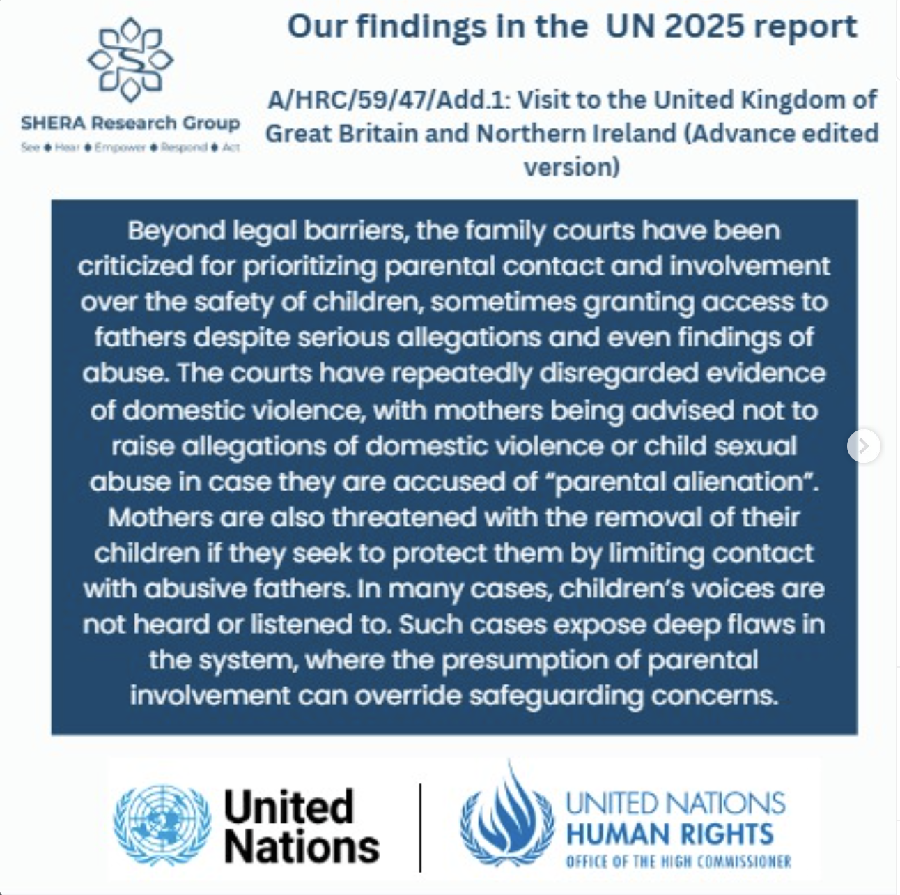 In 2023, the United Nations Special Rapporteur on violence against women and girls, Reem Alsalem, presented a report to the Human Rights Council (A/HRC/53/36) examining the intersection of custody proceedings, violence against women, and violence against children across multiple jurisdictions, including the United Kingdom.